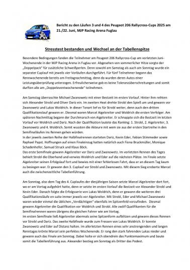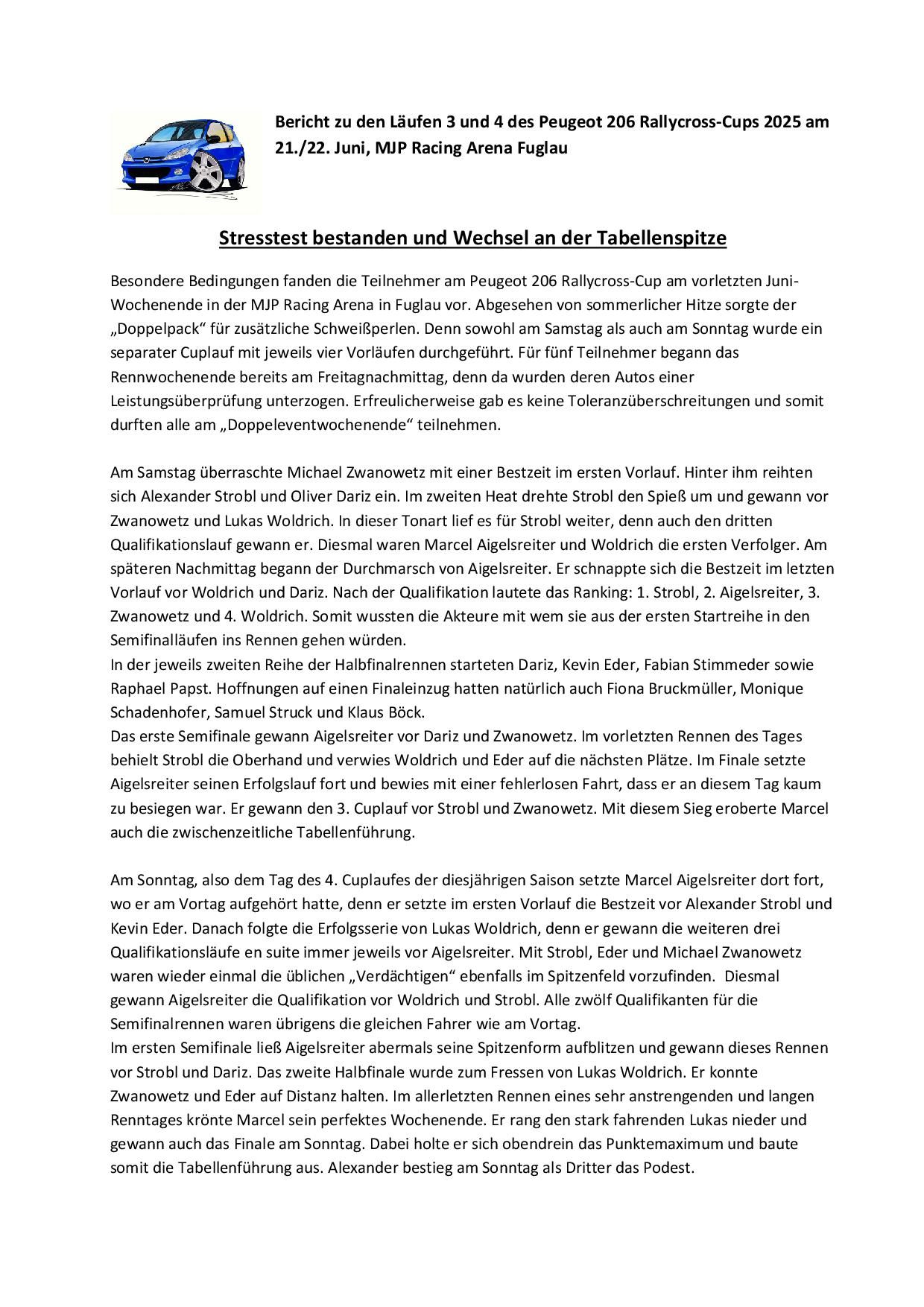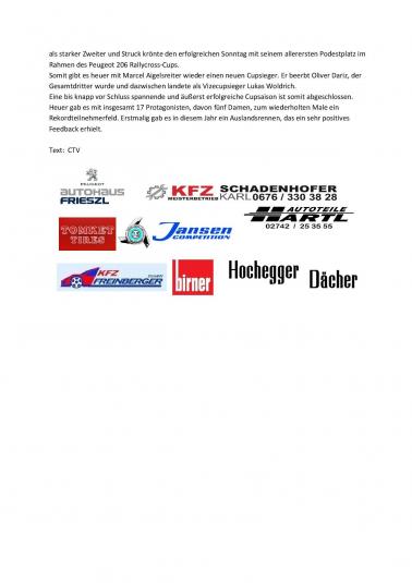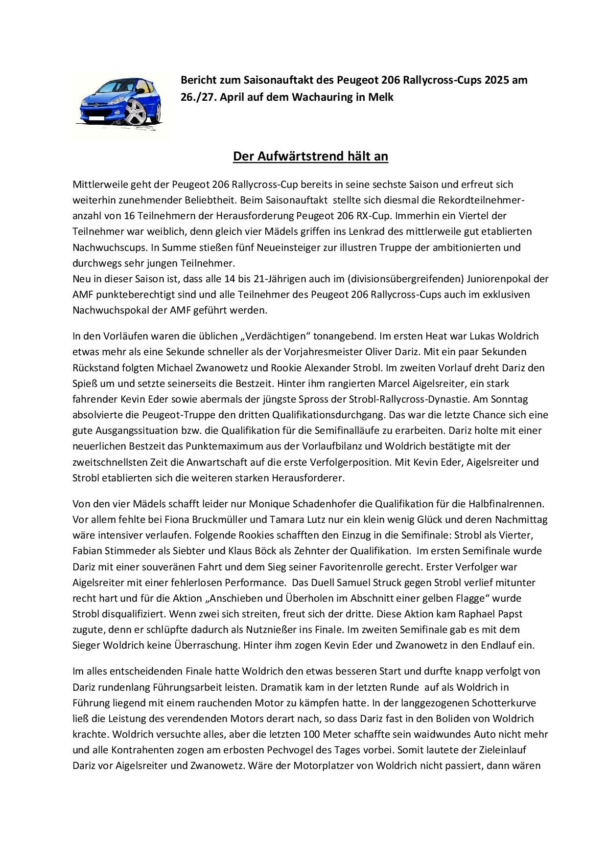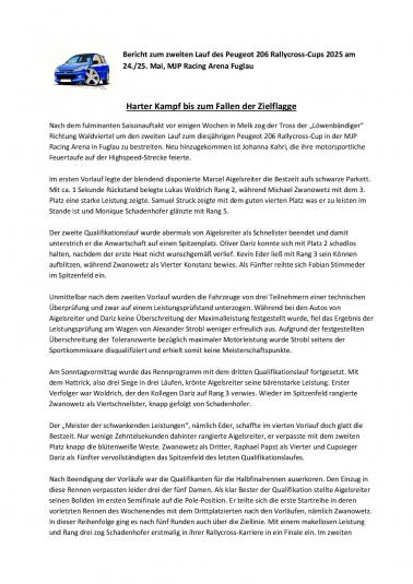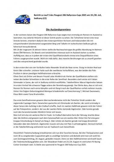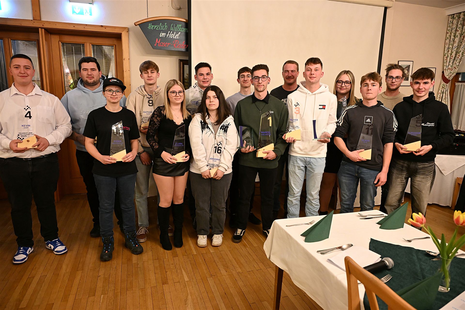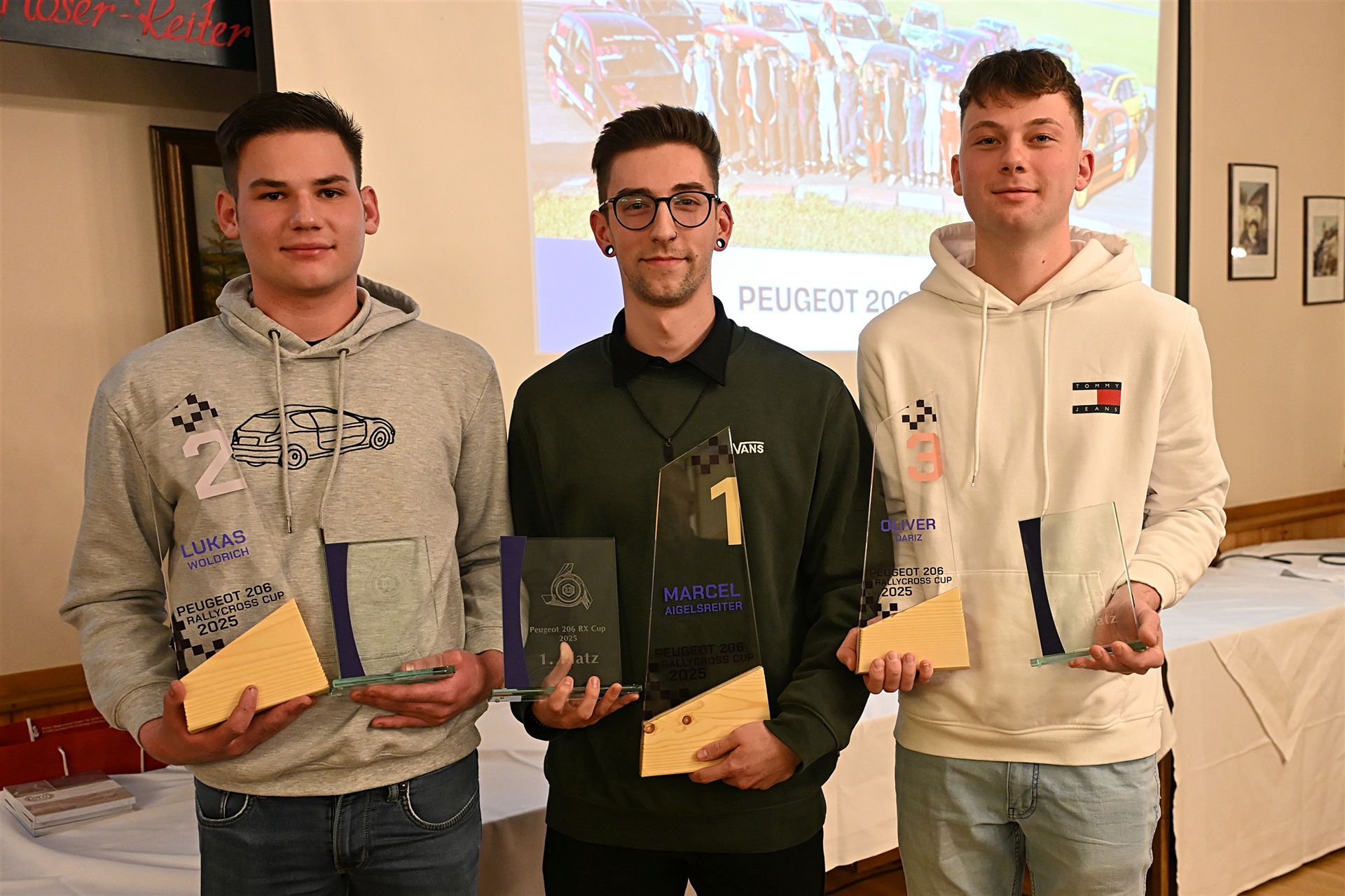 Am Freitag den 16.01.2026 wurden alle Teilnehmer der Rallycross Nachwuchsklasse Peugeot 206 Cup ausgezeichnet. Im Peugeot 206 RX-Cup in Österreich können junge Rennfahrer bereits ab 14 Jahren teilnehmen, sofern sie die entsprechende Lizenz (AMF-Lizenz) besitzen und ihren 14. Geburtstag im Kalenderjahr erreicht haben. Der Cup dient als Einstieg in den Rallycross-Sport und ist eine gute Möglichkeit für Einsteiger, da die Fahrzeuge (Peugeot 206 mit ca. 75 PS) spezielle Sicherheitsausrüstungen haben und Kostengünstig sind. Der RX 206 Cup wurde 2020 von Karl Schadenhofer, Christian Wurzer, Erwin Frieszel und Peter Freinberger ins Leben gerufen und erfreut sich immer größerer Beliebtheit. Waren es 2020 gerade mal 5 Starter standen letztes Jahr schon 17 Teilnehmer im Alter zwischen 14 und 30 Jahren auf der Startlinie, wobei 5 Teilnehmer Frauen waren. Die Dominatoren des letzten Jahres das bis zum letzten Rennen zum zerreißen spannend war bekamen bei der Siegerehrung Pokale, Gutscheine sowie Sachpreise überreicht. Erster und damit österreichischer RX Peugeot 206 Cupsieger 2025 wurde Marcel Aigelsreiter aus Melk 129 Pkt. vor Lukas Woldrich aus Pöchlarn 126 Pkt. und Oliver Dariz aus Bergland mit 120 Pkt.